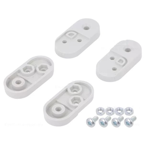 Držák na zeď určený pro upevnění vyhodnocovací jednotky eSTUDNA2 nebo eSTUDNA2‑DUO ke svislé ploše. Součástí dodávky je sada montážního materiálu: závěsná oka, 4× úchyty, 4× matice M4 a 4× šroub M4. Držák neobsahuje zařízení ani kabely, slouží jako pevná instalační podpora pro umístění jednotky.