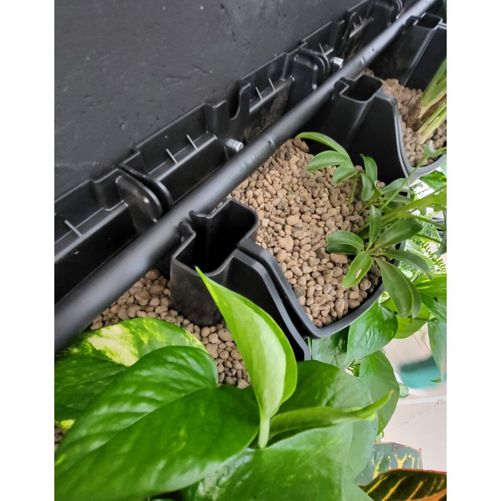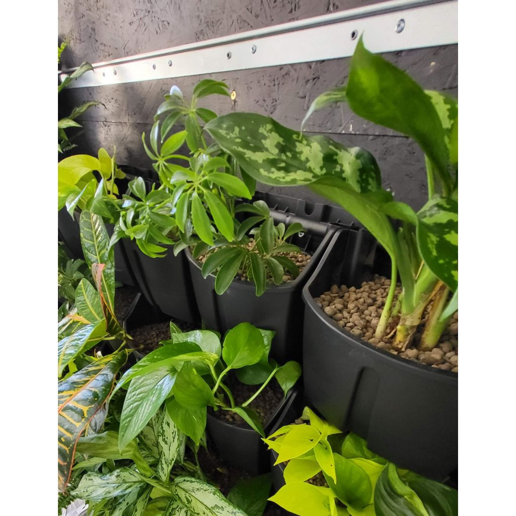 Hydroponický truhlík je určen pro jednu rostlinu. Má nadstandardní objem 2,8 l, což umožňuje rostlině vytvořit silný a odolný kořenový systém. Kořeny rostlin v živé stěně nejsou navzájem prorostlé a je tak velmi snadné provést výměnu rostliny nebo celého truhlíku.V truhlíku je v horní části integrován otvor pro vložení kapkovacího potrubí, které pak vede lineárně horizontálně přes všechny truhlíky živé stěny. Nad každým truhlíkem se umisťuje jeden kapkovač a je tak možné přesně nastavit dávkování vody k jednotlivým rostlinám.