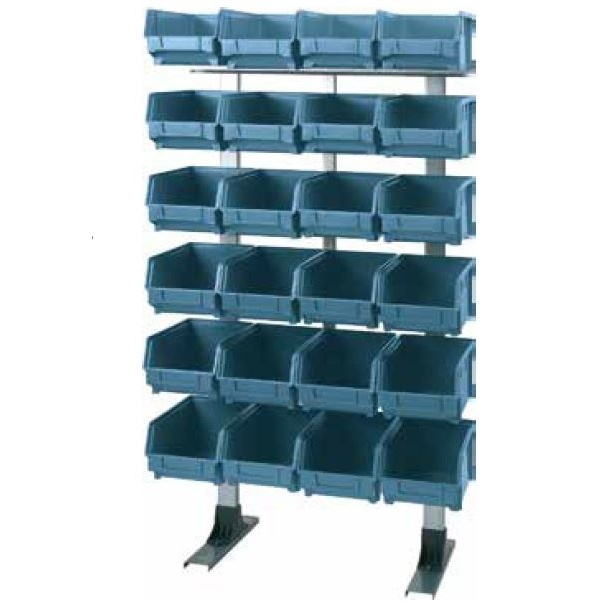 Kovový regál osazený 24 kusy plastového boxu o rozměrech 146x237x124mm (obj. č. 55253)