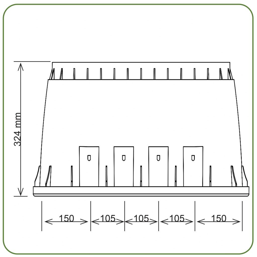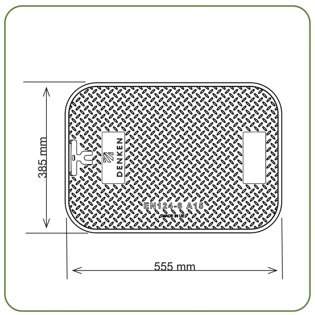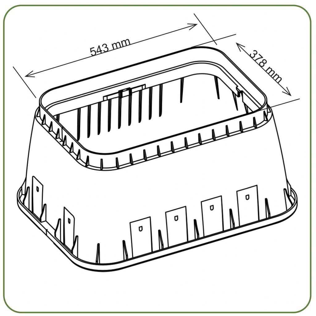 Ventilová šachtice bez otvorů, výška 38,5 cm, základna 66 x 55,5 cm, víko 41 x 28 cm, výklopné madlo, držák vodotěsných konektorů, certifikace UNI EN 124-6 pro třídu zatížitelnosti A15.