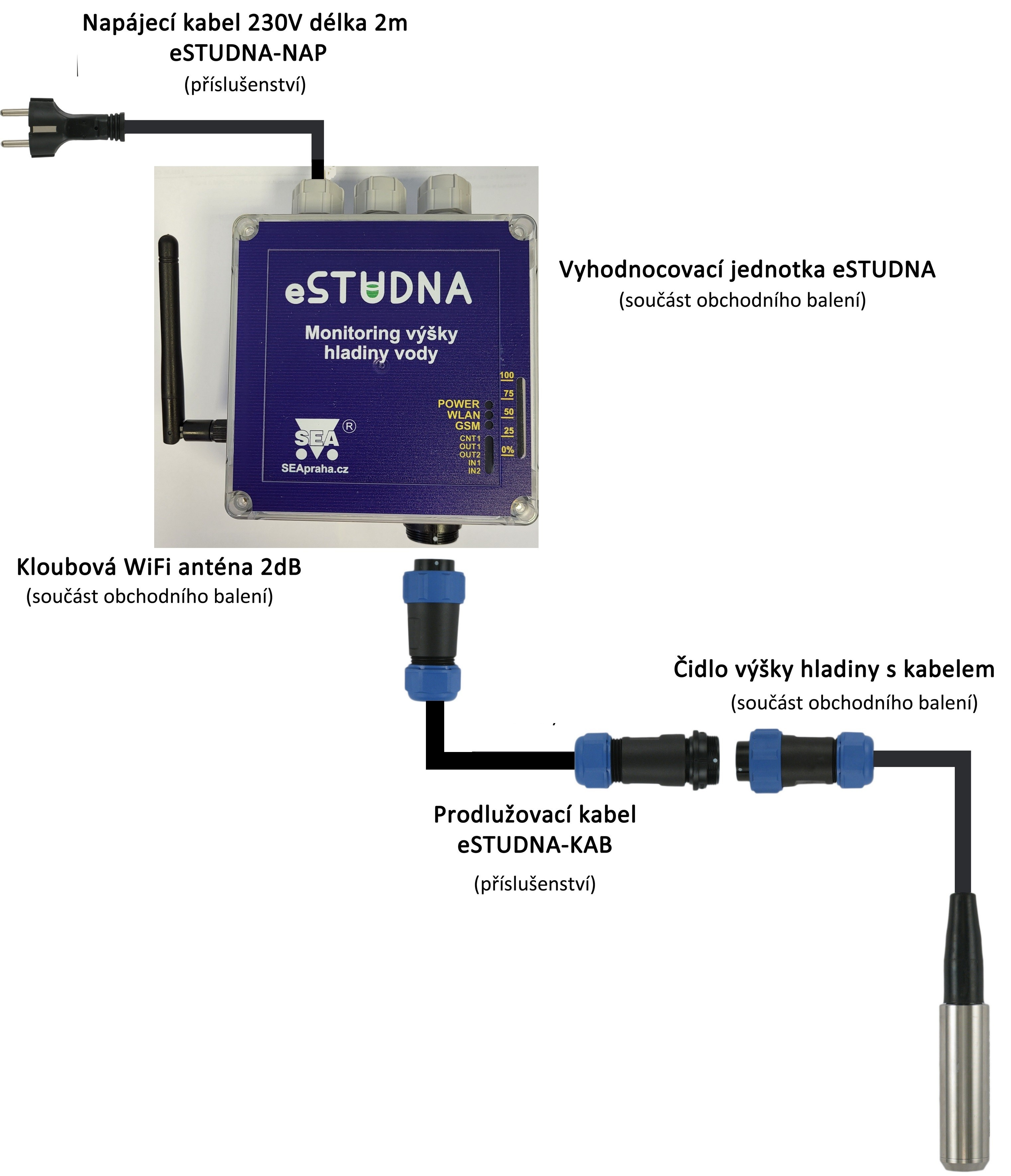 Instalace zařízení eSTUDNA je velmi jednoduchá. Tlakové čidlo ponoříte do studny nebo nádrže, vyhodnocovací jednotku připojíte k napájení 230V a spárujete s Vaší domácí Wi-Fi. Pro párování vyžaduje eSTUDNA mobilní telefon nebo tablet s podporou Bluetooth 4.0 nebo vyšší verzi. Naměřené hodnoty se zobrazují jak v mobilní aplikaci Vašeho chytrého telefonu, tak i na webové stránce. Máte tedy kdykoliv on-line přístup k naměřeným datům. Ve webové aplikaci jsou naměřené hodnoty hladiny vody přehledně zpracovány do grafu. Všechna naměřená data jsou archivována po dobu 3 měsíců, takže je možné sledovat i historii měření.