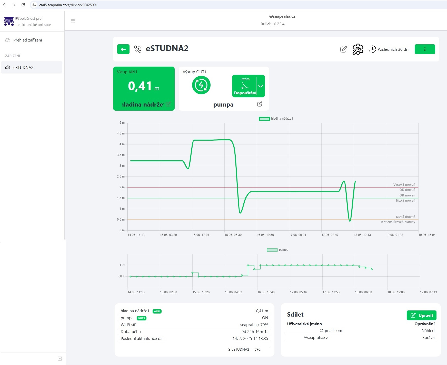 On-line aktuální stav hladiny vody, přehledný graf s historií hladiny, nastavení alarmu při překročení minimální nebo maximální hladiny, ovládání spínání čerpadla v automatickém režimu nebo přes webovou aplikaci, jeden digitální výstup (relé).Specifikace
