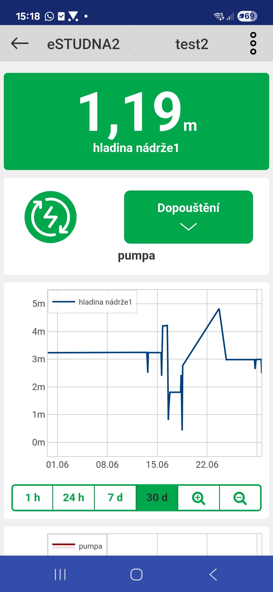 eSTUDNA navíc obsahuje jeden výstup s relé. Pokud k tomuto výstupu zapojíte Vaše čerpadlo, či ventil pro dopouštění, můžete ho vzdáleně ovládat. Pro relé je možno nastavit dvě hladiny, při kterých dojde ke změně stavu (zapnutí/vypnutí spotřebiče). Zapínání a vypínání výstupu může fungovat v automatickém režimu, který si nastavíte v aplikaci. Druhou možností je spouštět čerpadlo pouhým kliknutím na tlačítko v aplikaci, tedy vzdáleně bez nutnosti osobní přítomnosti u čerpadla.